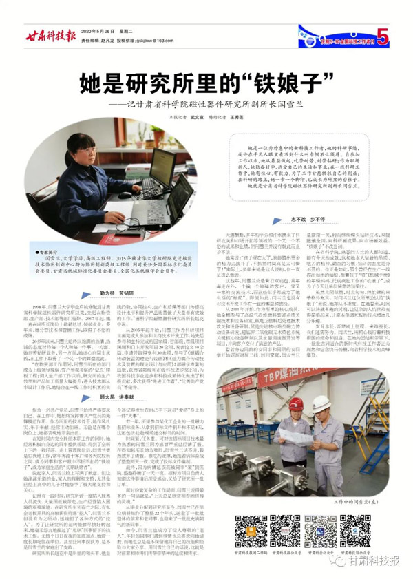 1998年,閆雪蘭大學(xué)畢業(yè)后被分配到甘肅省科學(xué)院磁性器件研究所以來,先后在物資部、生產(chǎn)部、技術(shù)部等部門任職。2007年起,她一直在副所長崗位上勤勤懇懇、兢兢業(yè)業(yè)。多年來,她分管技術(shù)和營銷工作,取得了不俗的成績。20多年以來,閆雪蘭始終以飽滿的熱情、熱誠的態(tài)度對待每一個人和每一件事。一方面,她刻苦鉆研業(yè)務(wù),另一方面,她虛心向同事求教,在工作上取得了一個又一個的輝煌成就。“在物資部工作期間,閆雪蘭所在的部門成為上級領(lǐng)導(dǎo)視察、客戶參觀考察的‘定點’樣板工程;調(diào)入生產(chǎn)部工作以后,研究所的生產(chǎn)效率和產(chǎn)品加工質(zhì)量大幅提升;進(jìn)入技術(shù)部從事設(shè)計工作后,她結(jié)合在一線工作時積累的實踐經(jīng)驗,協(xié)同技術(shù)、生產(chǎn)和質(zhì)保等部門為提高設(shè)計水平和提升產(chǎn)品質(zhì)量做了大量卓有成效的工作!笔】茖W(xué)院磁性器件研究所所長趙克中說。從2005年起開始,閆雪蘭作為科研項目主要完成人參加和主持技術(shù)開發(fā)工作,她先后參與和主持完成的國家級、省部級、市級項目課題和自主開發(fā)項目20余項,發(fā)表論文10余篇,申請并取得專利30余項,參與了《磁耦合傳動裝置的理論與設(shè)計》和《磁力耦合傳動技術(shù)及裝置的理論設(shè)計與應(yīng)用》2部磁學(xué)專著的出版,獲得省部級和市級科技進(jìn)步獎2項,為我國科技事業(yè)進(jìn)步和科技成果轉(zhuǎn)化做出了積極貢獻(xiàn),多次獲得“先進(jìn)工作者”、“優(yōu)秀共產(chǎn)黨員”等榮譽(yù)。